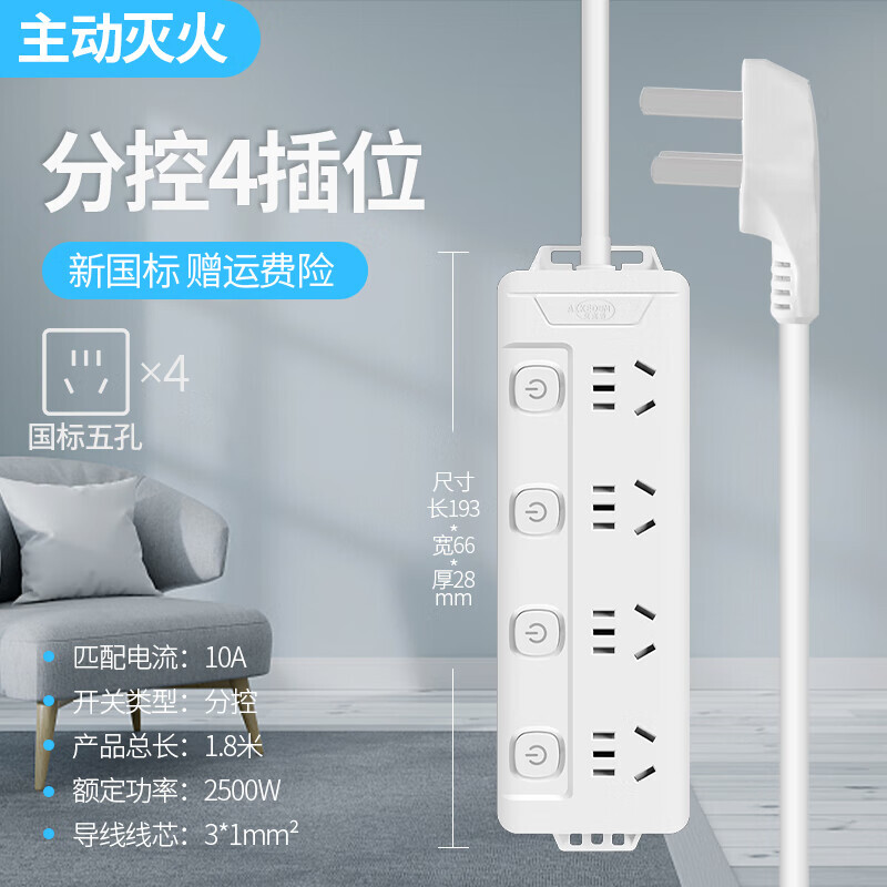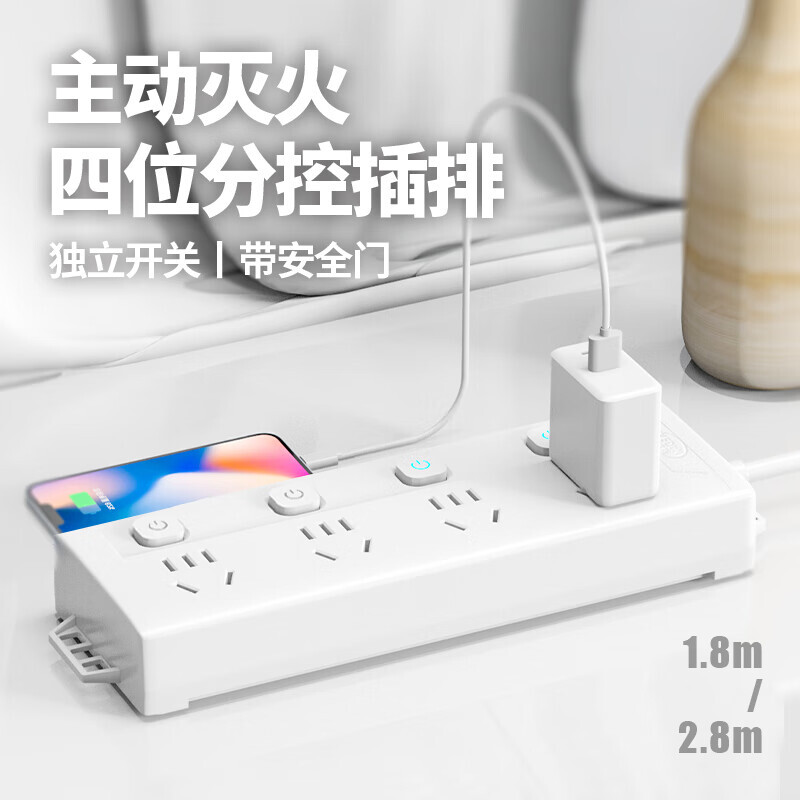 AIKEDUN 艾克盾 4位分控灭火插排 分控4插位 1.8M 29.9元(需用券)