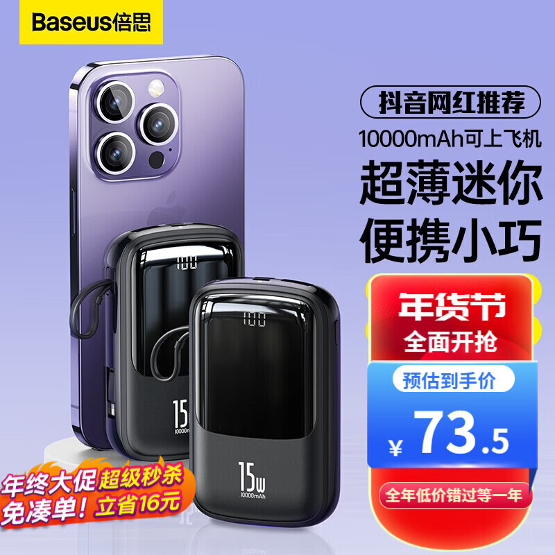 BASEUS 倍思 BS-P1002L 自带线充电宝 10000mAh 7.5W 72.22元(需用券)