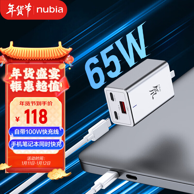 nubia 努比亚 PA0202 65W氮化镓GaN pro 线充套装 118元包邮(需用券)