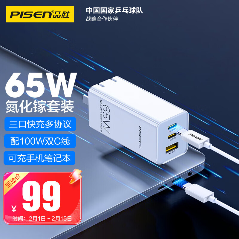 PISEN 品胜 65W氮化镓快速充电器 2C1A 线充套装 89元(需用券)
