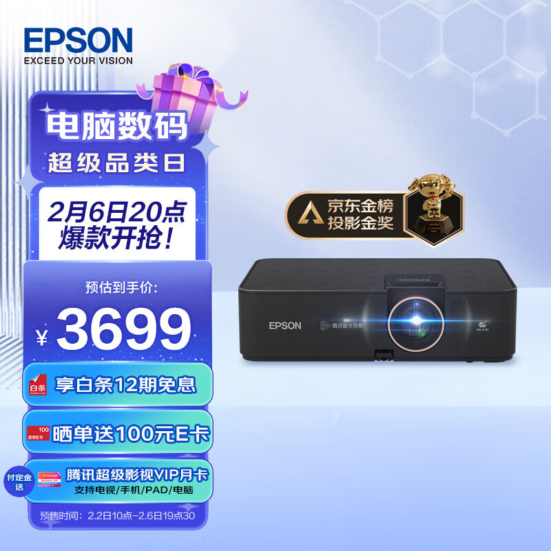 PLUS会员:EPSON 爱普生 CH-A100 家庭影院智能投影机 3649元(包邮,需100元定金,6日20点付尾款,需用券)12期免息,晒单返100元E卡