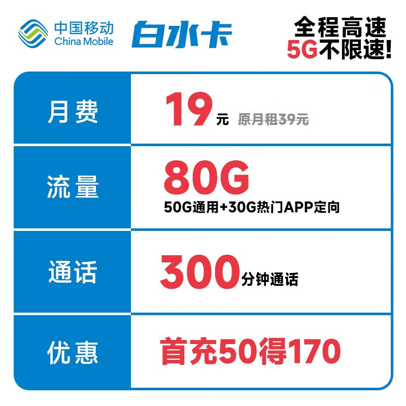 值友注意了,移动19元套餐强势加入内卷,打爆电信还有联通所有套餐1、移动白水卡,19月租,每月50G通用流量+30G定向流量+300分钟国内通话,性价比超高2、低月租+大流量+大语音 还是移动卡!优惠期1年3、快递上门现场激活,激活后店铺联系客服在专属链接参与存50送120,不要在快递员处充值!4、老号码不想更换,可改低月租保号套餐(如电信5元无忧卡)搭配这个19元低月租套餐,一个月仅需二十来块钱,省钱的同时,流量还变多了5、难得的移动低月租好套餐,随时停车 对移动有刚需的值友赶紧上车