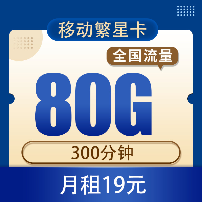 移动繁星卡--月租19元,享受每月80G全国流量+300分钟通话[强]首充50即可享受19元月租一年!
