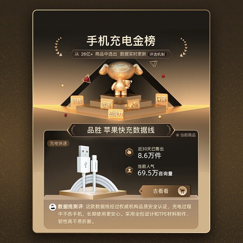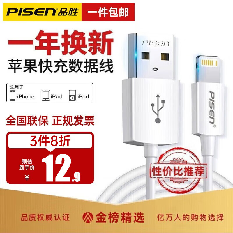 PISEN 品胜 升级款 Lightning 2.4A 数据线 PVC 1m 白色 12.94元(需买3件,共38.81元)