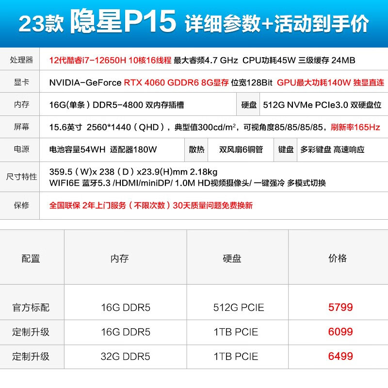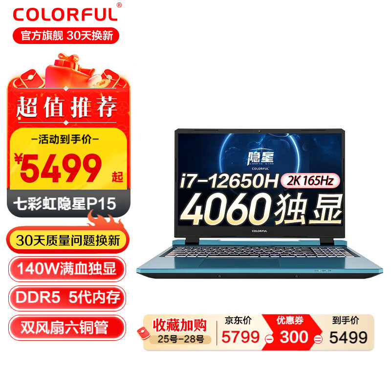 COLORFUL 七彩虹 隐星 P15 15.6英寸游戏本(i7-12650H、16GB、512GB、RTX 4060 5499元包邮(需用券)