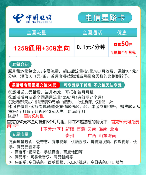 电信星路卡每月155G高速流量,1、包含125G通用流量+30G定向流量,接听免费2、首充50元可用半年(不超出套餐)3、星路卡半年后月租29元 到期不想用了可以随时在APP注销换一张新的优惠卡4、后期不用了可线上销户:“中国电信”APP-查询办理-办理-手机销户(按提示填写资料销户)
