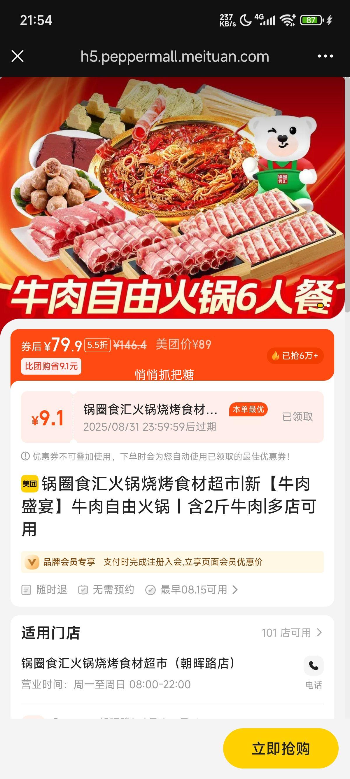 再降价:美团到店 锅圈食汇 新【牛肉盛宴】牛肉自由火锅|含2斤牛肉 6人餐 单人仅13.32元,原价146.4元现价79.9元