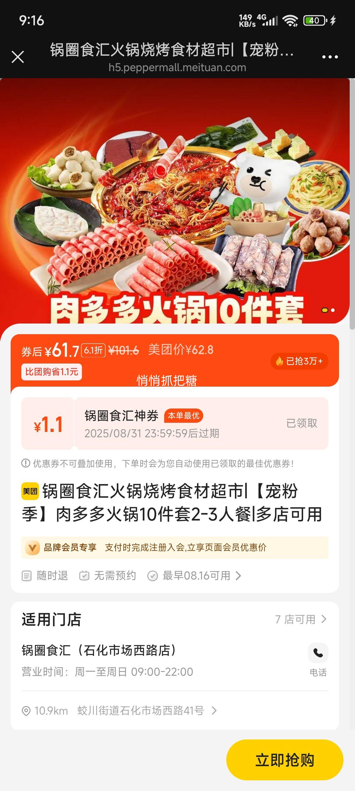 美团到店 锅圈食汇 【宠粉季】肉多多火锅10件套2-3人餐 原价101.6元现仅61.7元