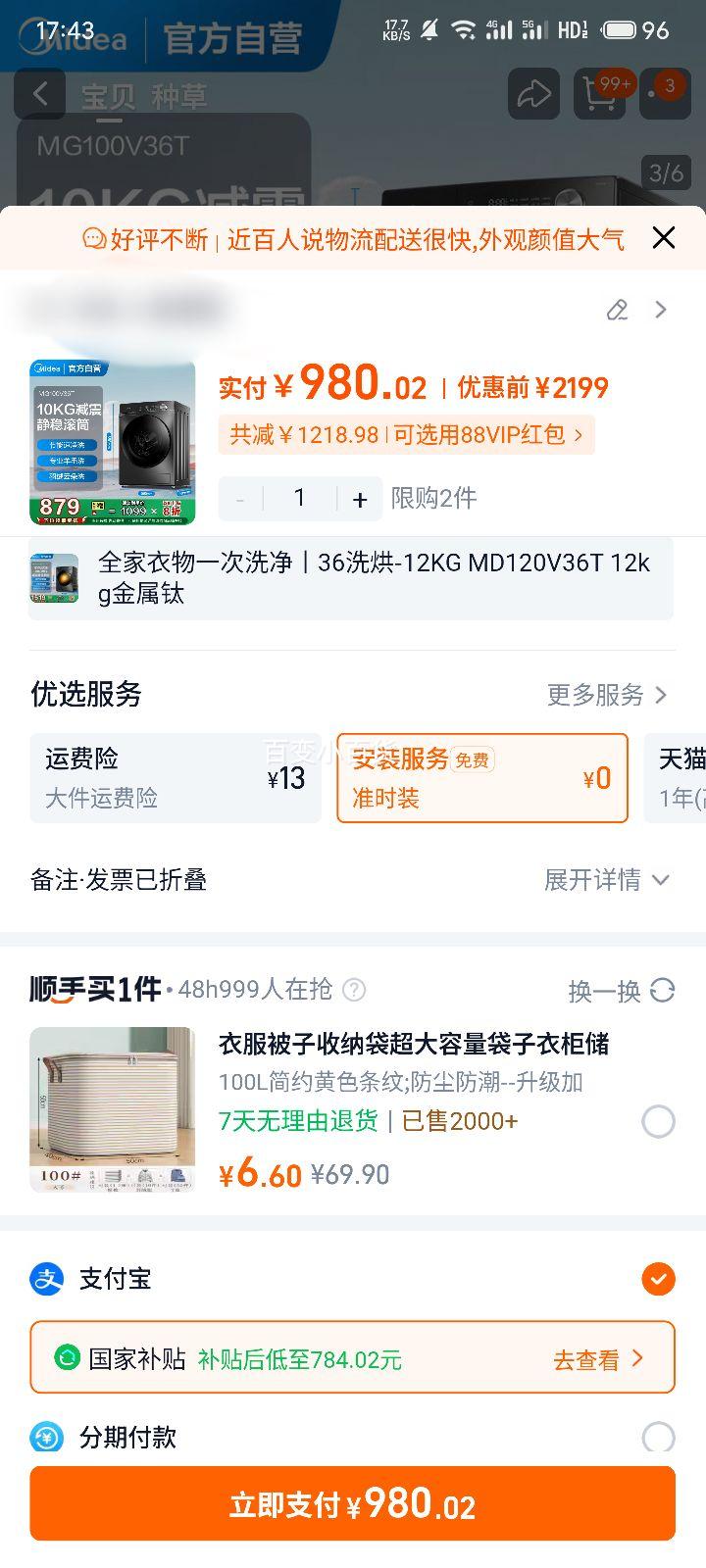再降价:美的官方10kg洗衣机全自动大容量滚筒 同价位更高配 节能速净 36单洗 774.02元(淘金币界面下单,晒单返10元后)+118.98元淘金币