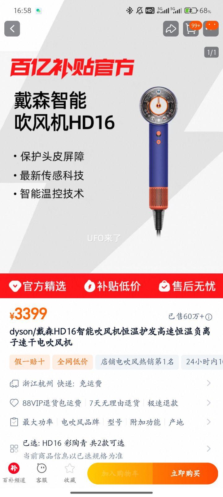dyson/戴森HD16智能吹风机恒温护发高速恒温负离子速干电吹风机 3399元