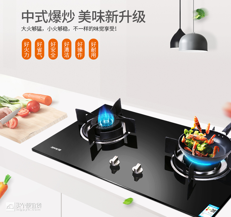 Joyoung 九阳6B216E台嵌两用燃气灶,采用3层防爆钢化玻璃面板,不留油渍不生锈,美观耐用易擦洗,3800w高效火力,内直外旋,提升59%热效率,一体成型加长无极混氧腔体设计,结合密集出火孔+3D补氧技术,燃烧更稳定,高档锌合金旋钮,手感更佳,带热电偶熄火保护装置。
