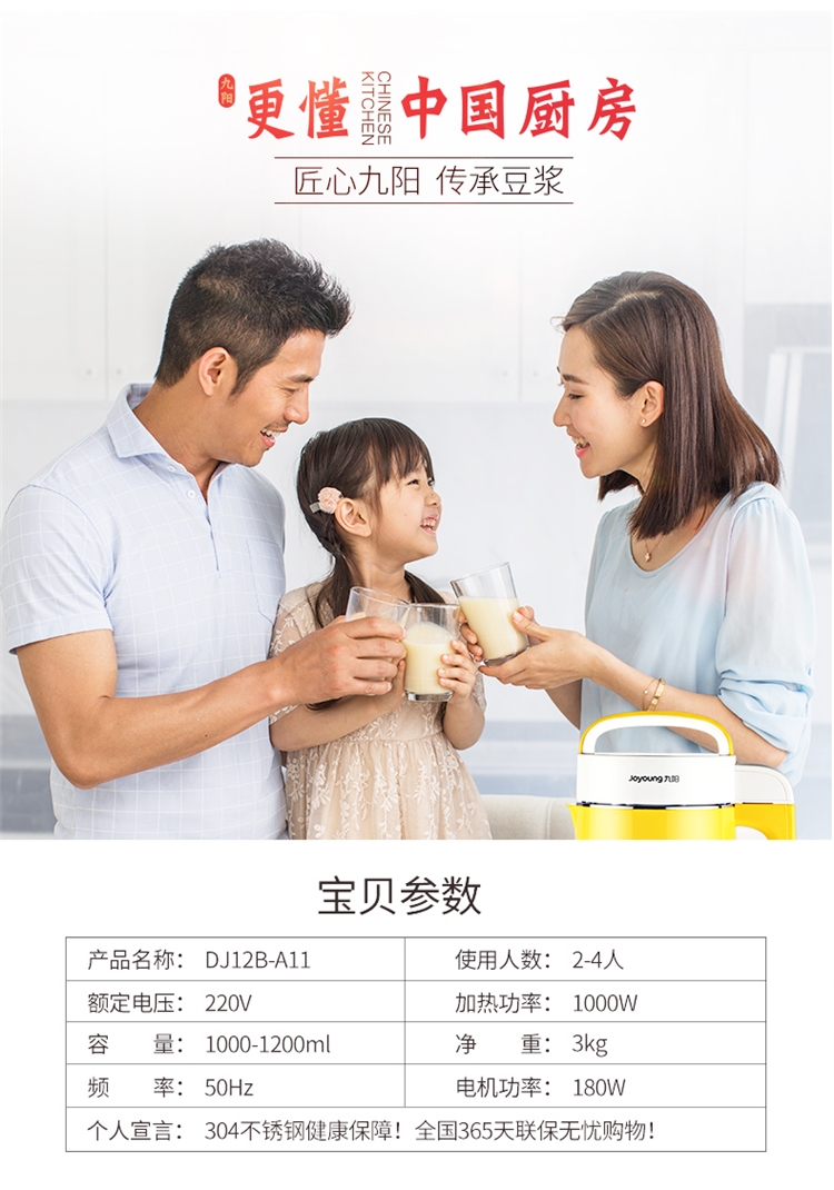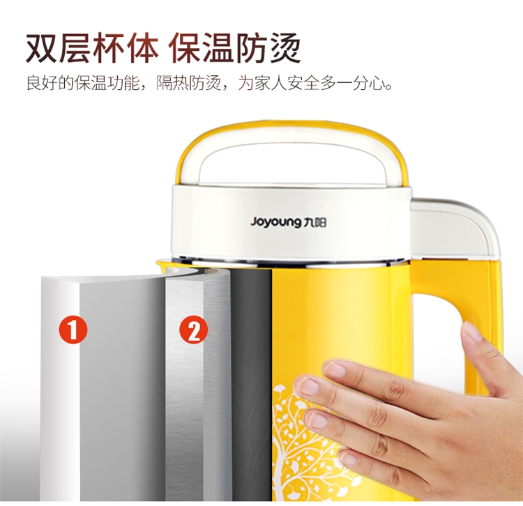 九阳DJ12B-A11有自动调节煮浆温度,超微精磨、智能温控、文火熬煮三大技术来实现豆浆的精细研磨和熬煮。同时具有磨出好豆浆,可以是五谷豆浆、纯香豆浆、干豆豆浆、果蔬冷饮、营养米糊、蔬菜浓汤、轻松洗、快捷、保温功能。九阳DJ12B-A11采用不锈钢机身、四刀头无网设计,操作按键被设定在了它的顶盖上,功能按键配合相应的图形。