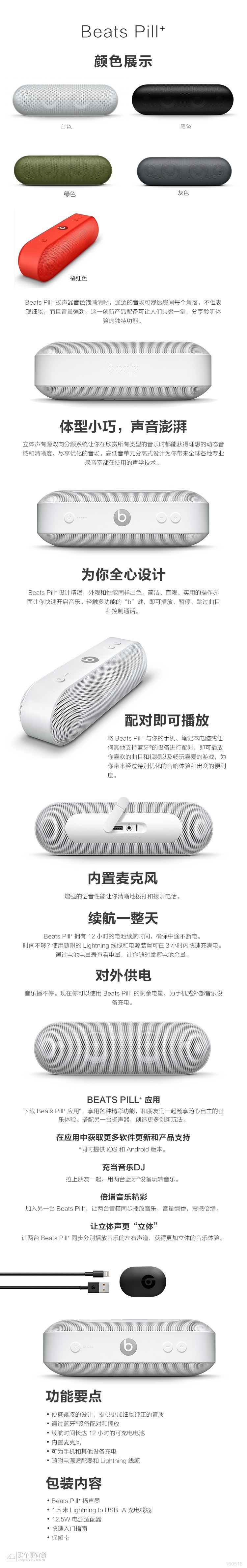 高低音单元分离式设计为你带来全球各地专业录音室都在使用的声学技术。Beats Pill+设计简约精致,与音质相得益彰。机身小巧紧凑,可以随意放进包包里带到任何地方。开关按钮现置于机身顶端,更轻松地掌控音乐。Beats Pill+电池可供12小时持续使用。使用随附的Lightening线缆和电源装置,只需3小时即可快速充电。通过电池电量表查看电量,让你随时掌握电池余量。更可通过USB接口为其他设备输出电量。