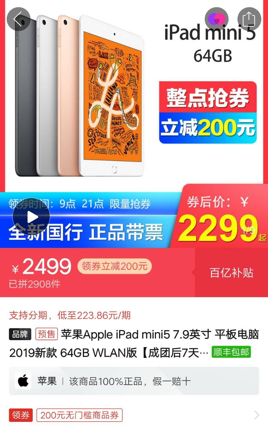 拼多多 1日9点:Apple 苹果 ipad mini 5 2019款 7.9英寸平板电脑 64GB WLAN 2299元包邮