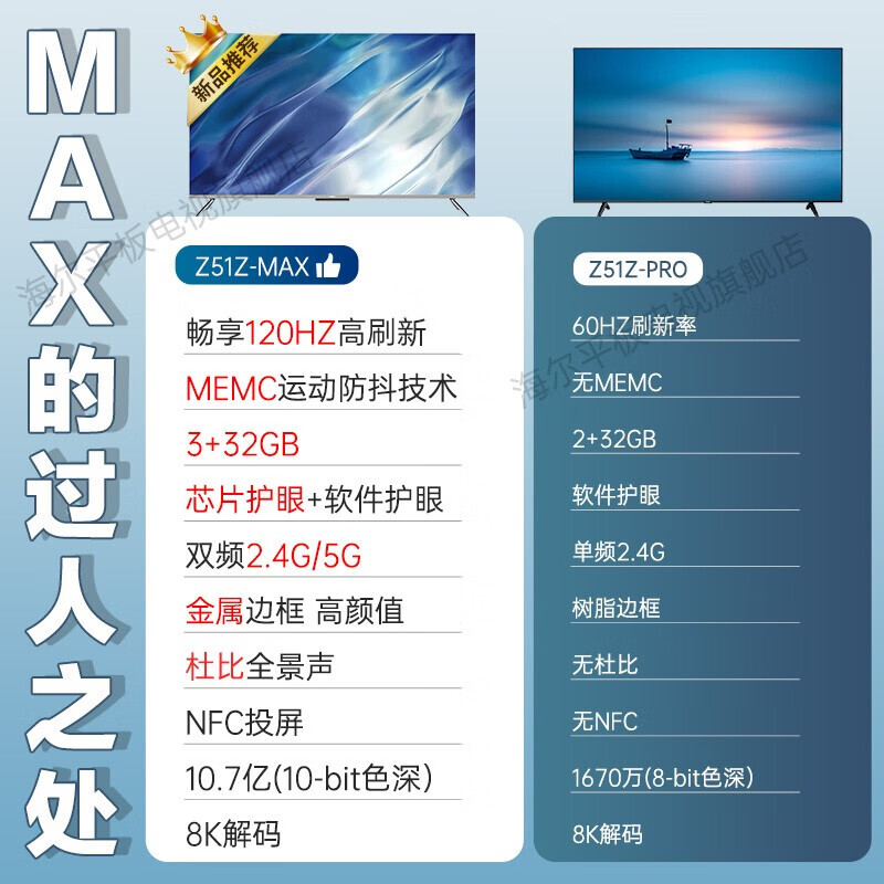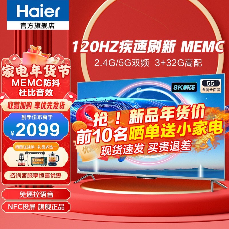 Haier 海尔 4K金属全面屏 8K解码投屏 55英寸120HZ 3+32G 杜比音效 双频WF液晶电视 2009元(需用券)