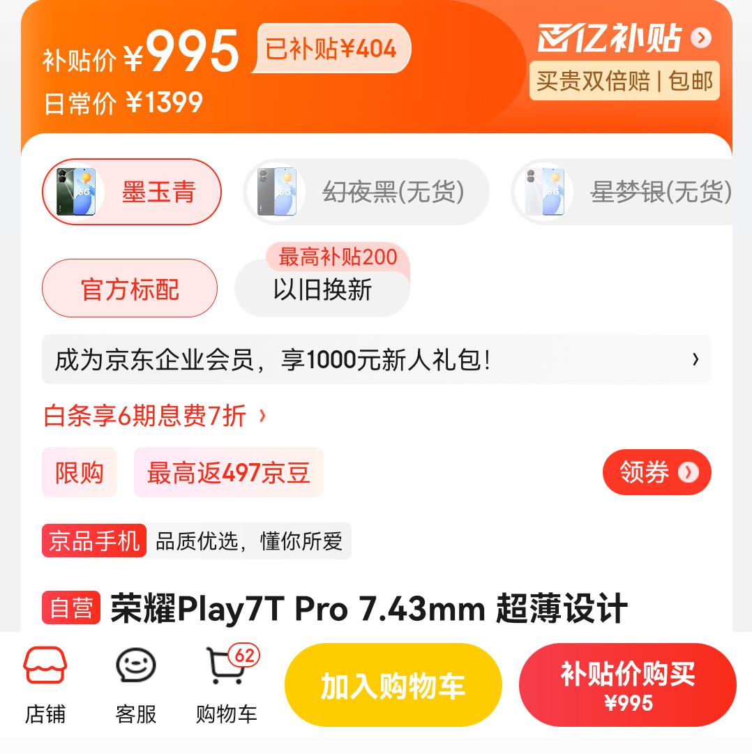京东百亿补贴:荣耀 Play7T Pro 8+128GB 5G手机 995元包邮