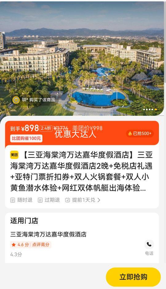 美头疼 三亚 网红双体帆船出海 万达嘉华 三亚海棠湾万达嘉华度假酒店2晚+免税 现价898元 原价3876(需领券)