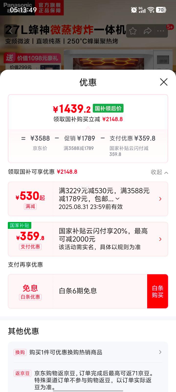 政府补贴:松下 微波炉 NN-DS57MWXPE 27升 1439.2元(需领券)