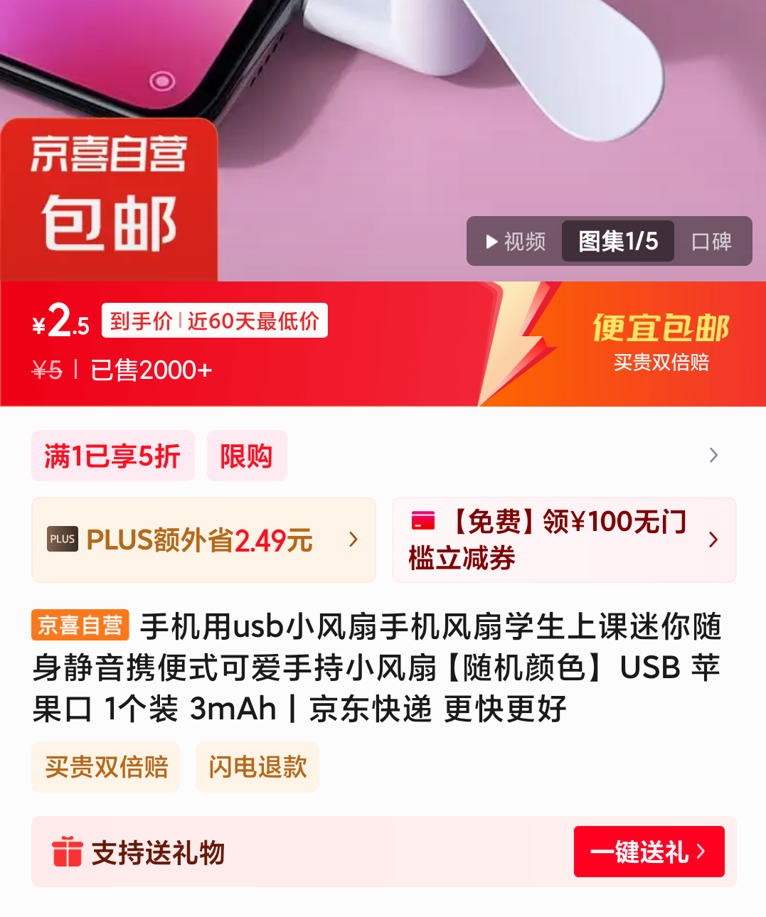 手机 用usb小风扇 随机颜色 USB 苹果口 1个装 3mAh 2.5元