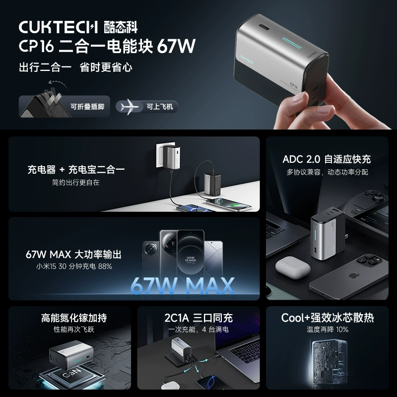 酷态科 CP16二合一电能块67W充电宝适用于苹果/小米/华为手机笔记本移动电源氮化镓 104.17元