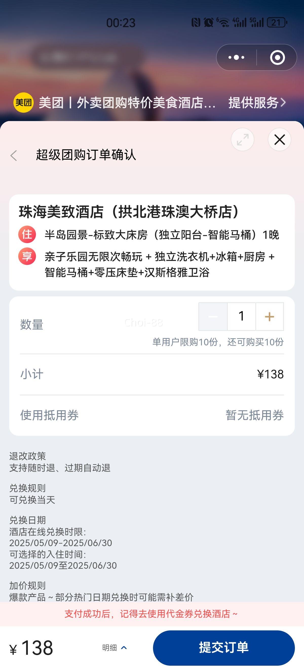 珠海美致酒店(拱北港珠澳大桥店)1晚+亲子乐园无限次畅玩+智能马桶+零压床垫+汉斯 原价666元现价138元