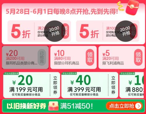 促销活动:京东 耳机音箱超级补贴会场 20点抢五折券 每晚抢五折券 耳机音箱可用