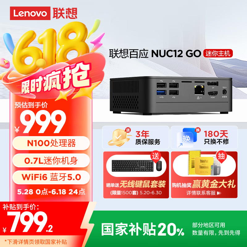 联想 Lenovo 百应 NUC12 GO 迷你主机(N100、集成显卡、8GB、256GB SSD) 499元