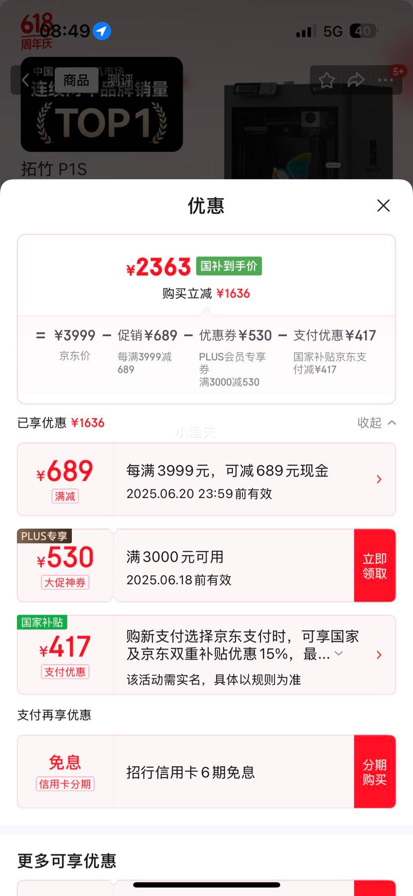 限地区、PLUS会员:拓竹P1S3D打印机桌面家用FDM全自动调平大尺寸高速3d打印机器ba 2363元包邮