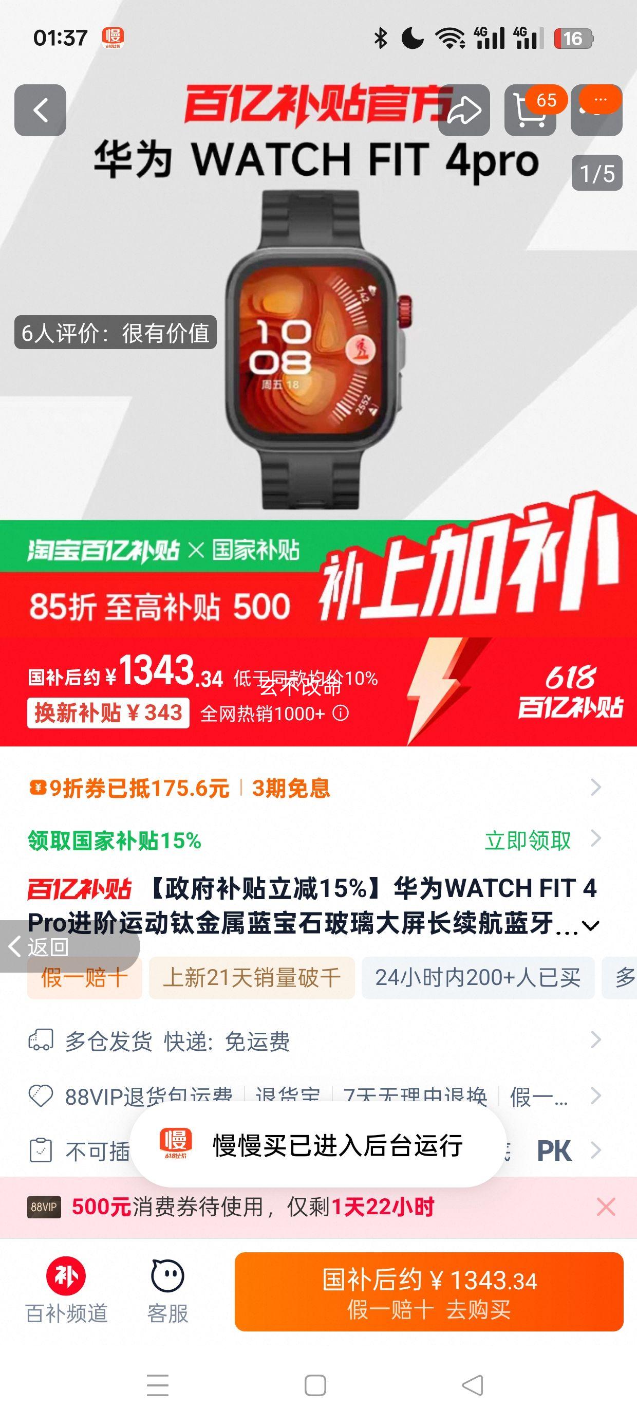 百亿补贴:华为WATCH FIT 4 Pro进阶运动钛金属蓝宝石玻璃大屏长续航蓝牙通话智能手表 1343.34元