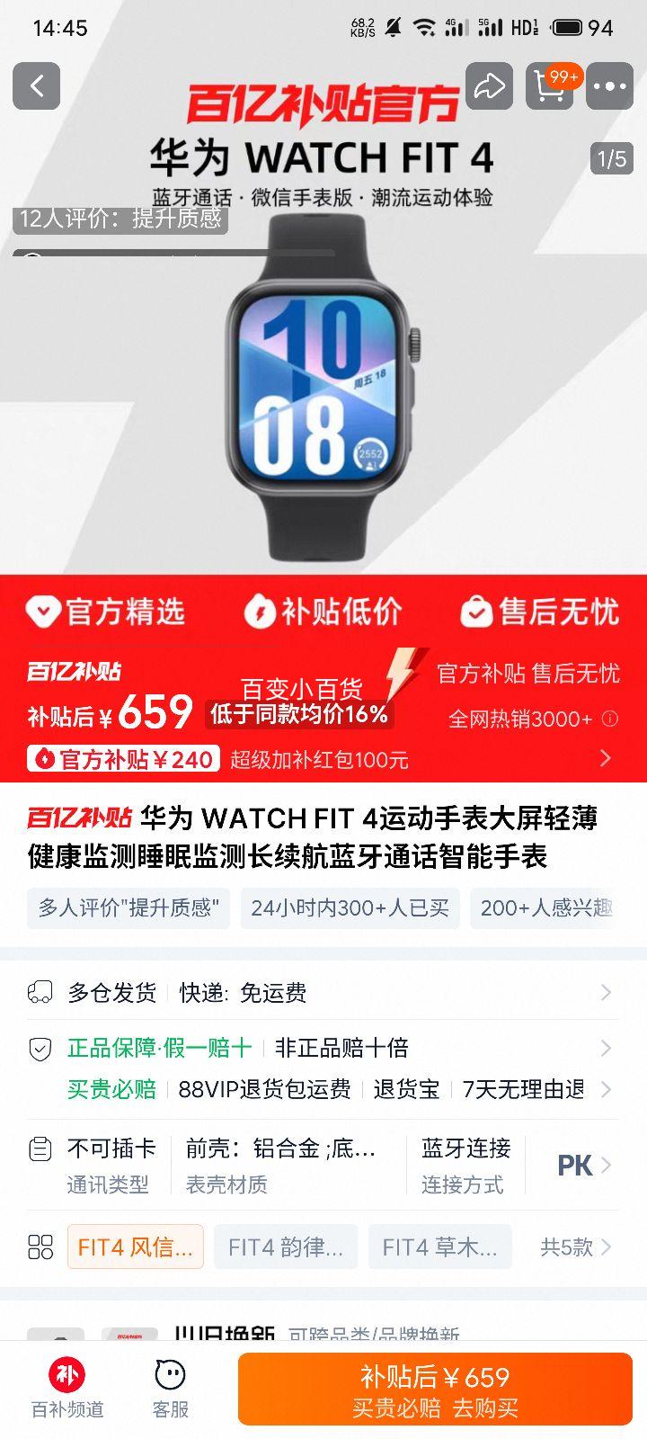 华为 WATCH FIT 4运动手表大屏轻薄健康监测睡眠监测长续航蓝牙通话智能手表 659元(需在百亿补贴界面找到商品下单)