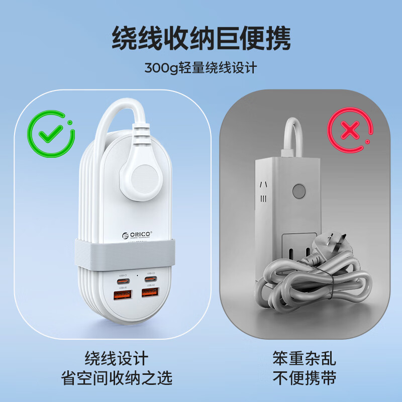 88VIP会员:奥睿科 65W氮化镓旅行排插usb快充便捷排口袋全长1.6米 132.05元
