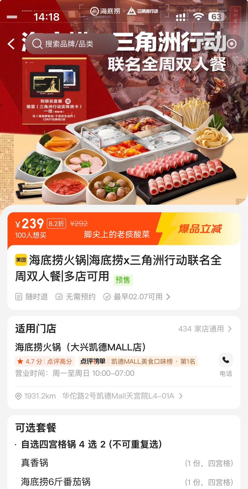 美团到店 海底捞火锅 海底捞x三角洲行动联名全周双人餐 多店可用 史低了!全周双人餐仅239元,原价292元,赠送联名房卡!未兑可随时退